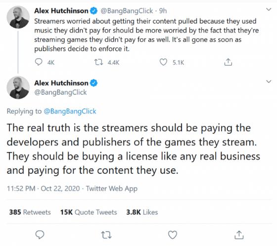 他在 Twitter 上說(shuō):“游戲主播擔(dān)憂他們的內(nèi)容被撤掉,因?yàn)樗麄兪褂昧藳](méi)有購(gòu)買的音樂(lè)。事實(shí)上,他們直播的游戲也沒(méi)有購(gòu)買,這只能讓他們更擔(dān)憂。一旦發(fā)行商們決定強(qiáng)制執(zhí)行,就全部消失了。