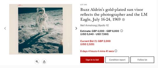 此次拍賣的亮點是一張阿姆斯特朗站在月球表面的照片,該照片由巴茲·奧爾德林(Buzz Aldrin)拍攝,拍賣預售估價在 37800 美元(約合人民幣 25 萬)到 63000 美元(約合人民幣 42 萬)。