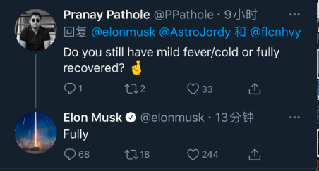 有網(wǎng)友詢問馬斯克,是不是還在低燒?抑或是已經(jīng)完全康復(fù)(fully recovered)?馬斯克回答說,完全康復(fù)。