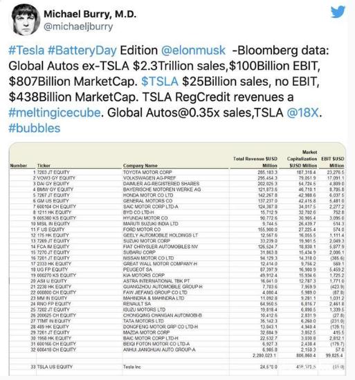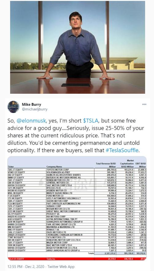 12 月 2 日消息,《大空頭》原型 Micheal Burry 今日在社交平臺上發(fā)布推文并@特斯拉 CEO 馬斯克(Elon Musk),表示自己正在做空特斯拉(TSLA.US)。此前,Micheal Burry 認為特斯拉的估值與業(yè)內(nèi)其他公司相比是荒謬的,他發(fā)布了一張截圖,顯示了特斯拉與其競爭對手的估值。