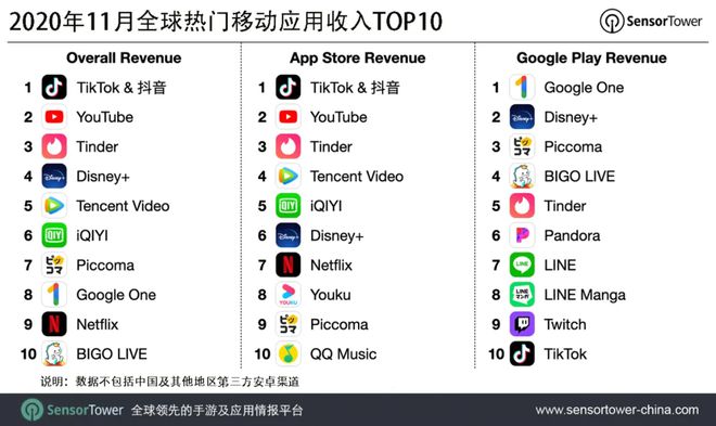 營收榜第二至五名分別為 YouTube,美國約會軟件 Tinder,流媒體平臺 Disney+ 和騰訊視頻。