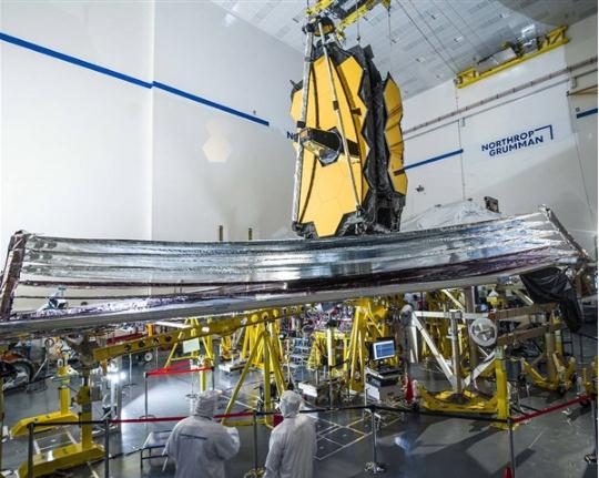 與此同時(shí),為了滿足韋伯望遠(yuǎn)鏡的需要,它還配備了同樣龐大、復(fù)雜的遮陽板——在太空中,有陽光照射的地方溫度可達(dá)上百度,沒有陽光照射的背面溫度則會(huì)零下上百度,溫差極大。