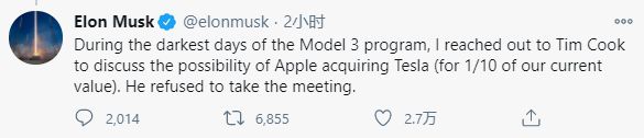 馬斯克在推文中表示,在公司開發(fā)特斯拉 Model 3 的“最黑暗日子”里,自己曾聯(lián)系蘋果商討收購(gòu)特斯拉的可行性。馬斯克表示,他想要以約600 億美元的估值將特斯拉賣給蘋果,這僅為當(dāng)前特斯拉市值的十分之一。