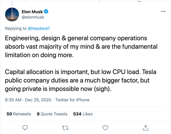 今日,特斯拉 CEO 埃隆·馬斯克發(fā)推稱,各種公司運營的事務(wù)令他精疲力盡,沒有精力兼顧其他,因此現(xiàn)在想私有化特斯拉是不可能的。