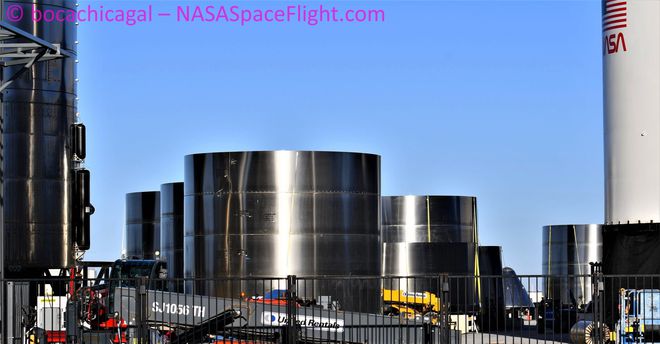 12 月 22 日的航拍照片還顯示,SpaceX 似乎是在一個 80 米高的高灣內(nèi)進行相關(guān)工作,將屬于超級重型火箭助推器原型 BN1 的兩個組件堆疊在一起。雖然不可能知道 SpaceX 公司在組裝 BN1 的確切程序,但至少有 12 個筒身正在堆疊階段,還有更多筒身等待加入主助推器的“堆棧”。