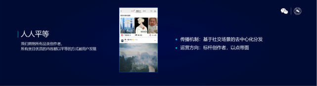 同時(shí),視頻號(hào)鏈接微信生態(tài)的打通能力,能借助公眾號(hào)、搜一搜、看一看、小程序等已趨成熟的產(chǎn)品,形成微信生態(tài)合力,使優(yōu)質(zhì)的內(nèi)容和服務(wù)輻射更多人。視頻號(hào)是一個(gè)人人平等的平臺(tái),每個(gè)個(gè)體都能被看見(jiàn),視頻號(hào)創(chuàng)作者產(chǎn)出的優(yōu)質(zhì)內(nèi)容,可以輕松借助朋友圈、微信群聊等途徑持續(xù)傳播,突破圈層讓更多人看到。“我們的愿景是所有品類(lèi)的創(chuàng)作者都會(huì)被擁抱,所有類(lèi)目的優(yōu)質(zhì)內(nèi)容都能以平等的方式被用戶發(fā)現(xiàn)”,微信視頻號(hào)團(tuán)隊(duì)在分享時(shí)談到。