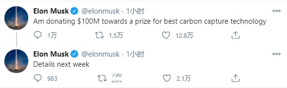 1 月 22 日消息,當(dāng)?shù)貢r間周四晚些時候,特斯拉首席執(zhí)行官埃隆·馬斯克(Elon Musk)通過 Twitter 宣布,自己將“捐贈 1 億美元,用于獎勵最佳的碳捕獲技術(shù)”。馬斯克計劃于下周提供相關(guān)細(xì)節(jié),這是其應(yīng)對氣候變化的最新舉措。
