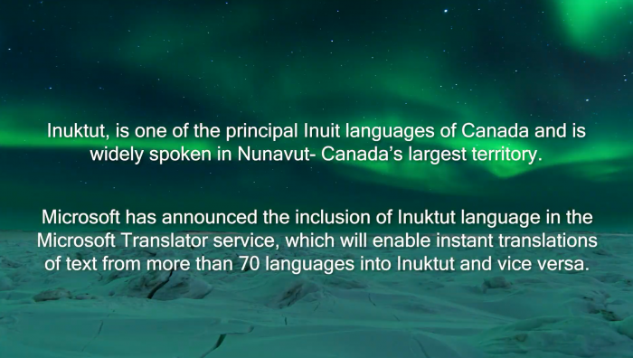 在努納武特地區(qū)政府的幫助下,微軟得以添加對(duì)該語(yǔ)言的支持,而因紐特語(yǔ)使用者通過(guò)跟微軟的合作以確保翻譯正確。