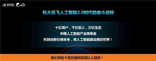 今天,科大訊飛發(fā)布人工智能 2.0 時代的奮斗目標:十億用戶,千億收入,萬億生態(tài)。