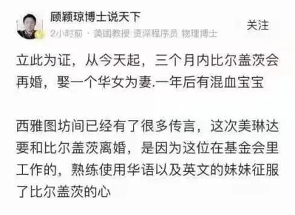 而在國(guó)內(nèi),社交媒體認(rèn)證為美國(guó)教授、資深程序員、物理博士的社媒號(hào)“顧穎瓊博士說(shuō)天下”發(fā)布消息稱(chēng):立此為證,從今天起,三個(gè)月內(nèi)比爾·蓋茨會(huì)再婚,娶一個(gè)華女為妻,一年后有混血寶寶。