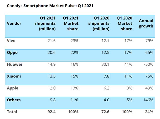 而根據Canalys中國區(qū)的報告,在中國市場,華為一季度的智能手機發(fā)貨量同比下跌了50%,市場排名從第一下跌至第三位,vivo、oppo、小米分別實現了79%、65%和75%的增長;而蘋果則實現了49%的增長,主要來自于iPhone12的貢獻。