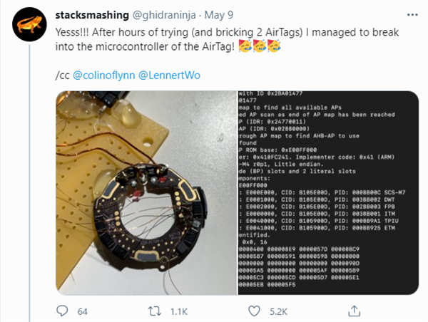 Stack Smashing 表示,在經(jīng)過數(shù)小時的嘗試后,他修改了 AirTag 的固件,最終發(fā)現(xiàn)微控制器可以重新編程,也就是說,黑客也可以用這種方式破解 AirTag,通過改變微控制器的編程從而改變其功能。