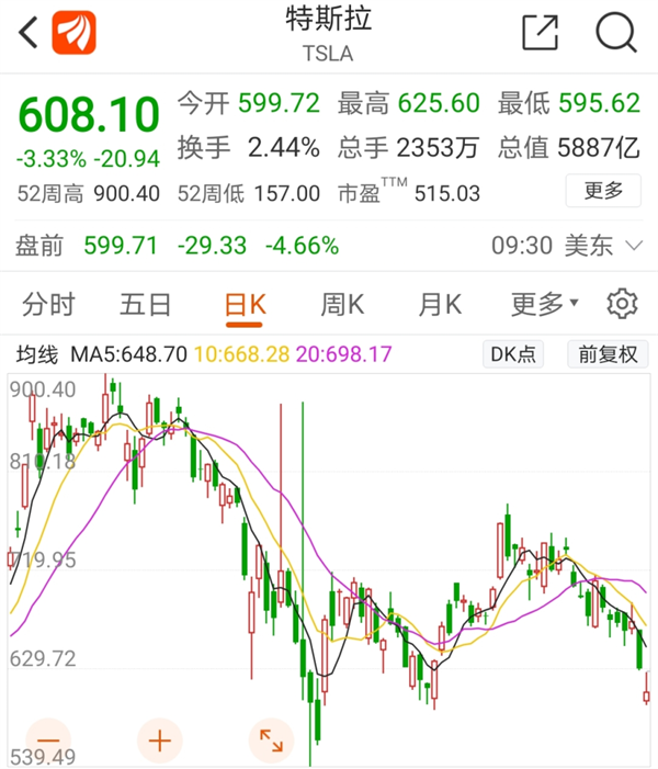 近期,特斯拉股價(jià)持續(xù)暴跌,較歷史最高位股價(jià)已經(jīng)跌去超過(guò)30%,11日盤前最大跌幅超過(guò)8%。美股開(kāi)盤后,特斯拉股價(jià)一度下挫逾5%,截至23:00點(diǎn),跌幅有所收窄,跌超3%。