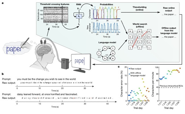 研究團(tuán)隊將人工智能軟件與一款腦機(jī)接口設(shè)備結(jié)合起來,與一名大腦中植入腦機(jī)接口設(shè)備的癱瘓患者合作,讓該患者想象他拿著一支筆,在一張橫線紙上“嘗試”寫字,就像他的手沒有癱瘓一樣。并將該男子手寫意圖快速轉(zhuǎn)換為電腦屏幕上的文本。