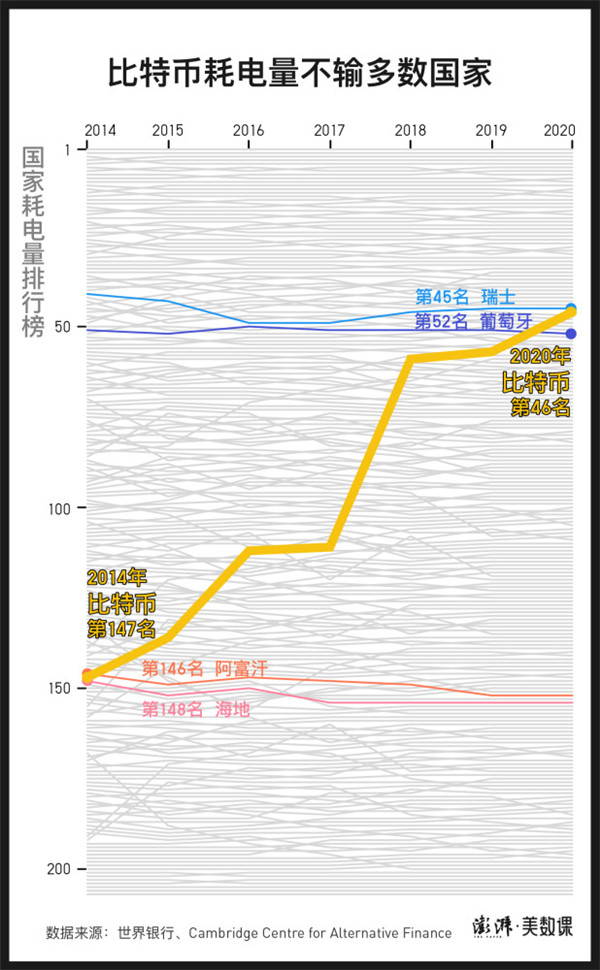 如果把比特幣視作一個(gè)國家,它將位列全球耗電量最大的前 30 國之一。根據(jù)劍橋大學(xué)替代金融研究中心的研究,截至 2021 年 5 月 10 日,全球比特幣挖礦的年耗電量大約是 149.37 太瓦時(shí)(1 太瓦時(shí)為 10 億度電),這一數(shù)字已經(jīng)超過馬來西亞、烏克蘭、瑞典的耗電量,已十分接近耗電排名第 25 名的越南。