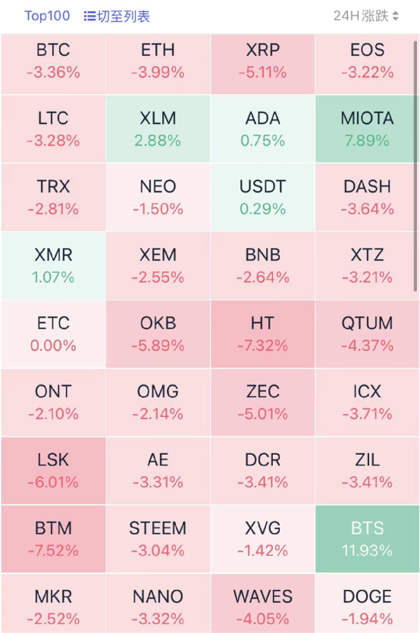 馬斯克的推特評論帶崩比特幣,其他加密貨幣也跟跌。(紅色代表下跌)