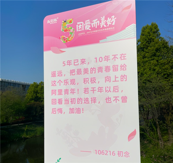 在阿里巴巴“五年陳”授戒的那幾天,西溪園區(qū)彩旗飄揚(yáng),一些老員工的祝福隨處可見。