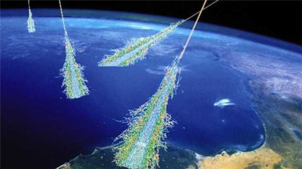 圖注:高能宇宙線轟擊地球大氣,產(chǎn)生的“空氣簇射”現(xiàn)象(示意圖)。