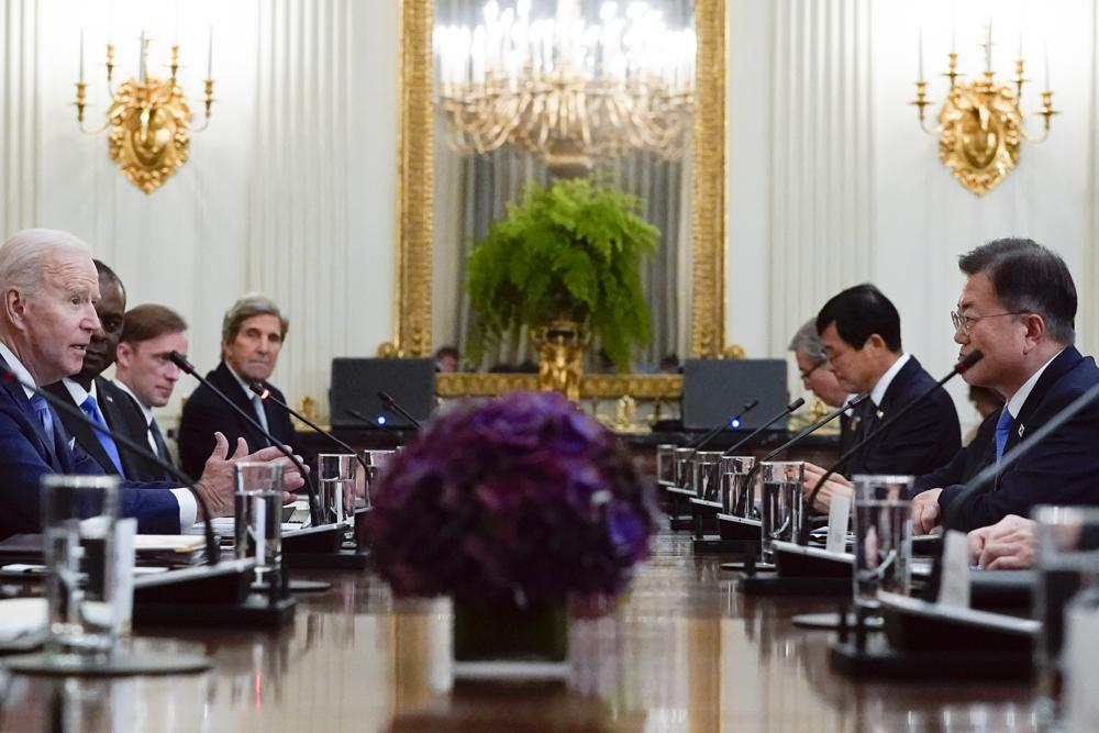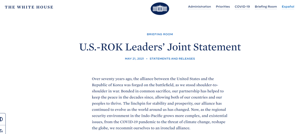 正在美國(guó)訪問(wèn)的韓國(guó)總統(tǒng)文在寅當(dāng)?shù)貢r(shí)間21日在白宮與美國(guó)總統(tǒng)拜登舉行會(huì)談,雙方就朝鮮半島局勢(shì)、雙邊合作及韓美同盟等交換意見,并發(fā)表了聯(lián)合聲明。根據(jù)白宮網(wǎng)站發(fā)布消息,這份聯(lián)合聲明果不其然提到了臺(tái)海和南海。
