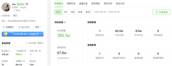 孫一寧抖音賬號(hào)“iiiis”6月16日新增粉絲185.1萬(wàn),其中直播漲粉67.8萬(wàn)。截至發(fā)稿,其抖音賬號(hào)擁有405萬(wàn)粉絲,且還在快速漲粉。