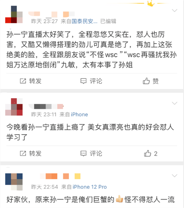 在昨晚的直播里,孫一寧也始終沒什么夸張的表情,直面網(wǎng)友的負(fù)面留言和調(diào)侃,來(lái)一個(gè)懟一個(gè)。