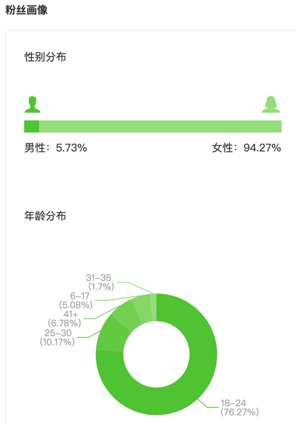 從她的直播粉絲畫像也可以看出這一點(diǎn),其中女性占比九成多,和孫一寧同年齡段的18-24歲的粉絲占比近八成,這與一般的顏值網(wǎng)紅的粉絲畫像有所區(qū)別。