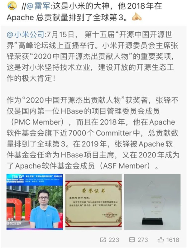 張鐸還在2020年榮獲了中國開源杰出人物,被作為小米技術(shù)立業(yè)的代表性人物和事件。