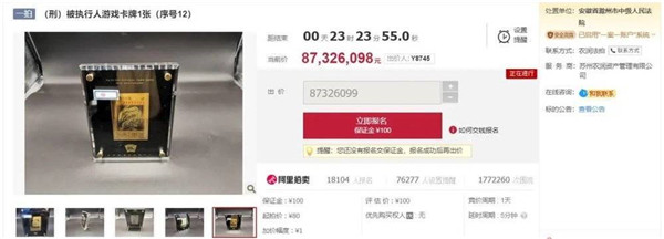 2021年6月21日,安徽省滁州市,滁州市中級(jí)人民法院以80元的底價(jià)在阿里法院拍賣平臺(tái)上掛出了一張編號(hào)為“No.12”的青眼白龍金卡,截止拍賣前圍觀人數(shù)達(dá)2,011,227次,共有18,104人報(bào)名拍賣,僅以每人100元押金計(jì)算,押金總額就達(dá)1,810,400元。