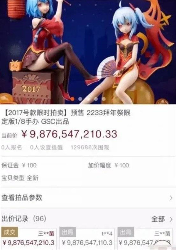 雖然,2017年也曾發(fā)生過一起震驚全網(wǎng)的“惡意競(jìng)拍”事件,當(dāng)年B站進(jìn)行2233娘2017號(hào)手辦拍賣時(shí)價(jià)格一度被人抬到98億7654萬(wàn),不過那終究是一場(chǎng)普通競(jìng)拍。