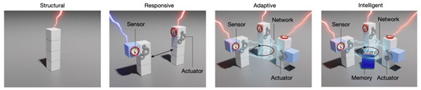研究人員認(rèn)為,可以通過用分層的方式定義人工物質(zhì)的智能。比如,通過結(jié)合四個(gè)關(guān)鍵功能元件來實(shí)現(xiàn)智能物質(zhì):(1)傳感器與環(huán)境交互并接收輸入和反饋;(2)執(zhí)行器對(duì)輸入信號(hào)做出響應(yīng)并調(diào)整材料的性能;(3) 用于長期存儲(chǔ)信息的存儲(chǔ)器;(4)用于處理反饋的通信網(wǎng)絡(luò)。
