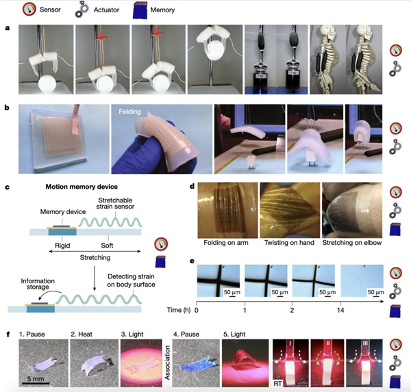 嵌入內(nèi)存的軟物質(zhì),這一類功能性軟物質(zhì)結(jié)合了物質(zhì)記憶和感知能力。有科學(xué)家在一種機(jī)械雜化材料中已驗(yàn)證這一概念,其中電阻開關(guān)器件作為剛性聚合光刻膠(SU-8)島上的存儲(chǔ)元件,該島嵌入可拉伸聚二甲基硅氧烷(PDMS)中,在聚二甲基硅氧烷上蒸發(fā)的金薄膜中的微裂紋同時(shí)起著電極和應(yīng)力傳感器的作用,這種運(yùn)動(dòng)記憶裝置允許基于應(yīng)力的變化和隨后的信息存儲(chǔ)來檢測(cè)人類的四肢運(yùn)動(dòng)。