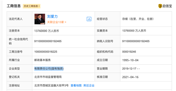 另據(jù)啟信寶數(shù)據(jù)顯示,中國郵政集團(tuán)由國務(wù)院100%控股,成立于1995年,注冊資本為1376億元,法人代表是劉愛力。