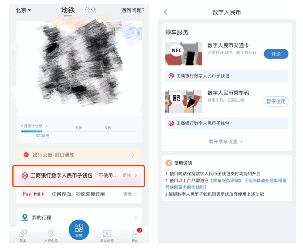 此次只需在工行數(shù)字人民幣“子錢包”中點(diǎn)選北京地鐵服務(wù)APP“億通行”,將兩者綁定之后,即可在“億通行”乘車碼頁面看到“數(shù)字人民幣專區(qū)”。