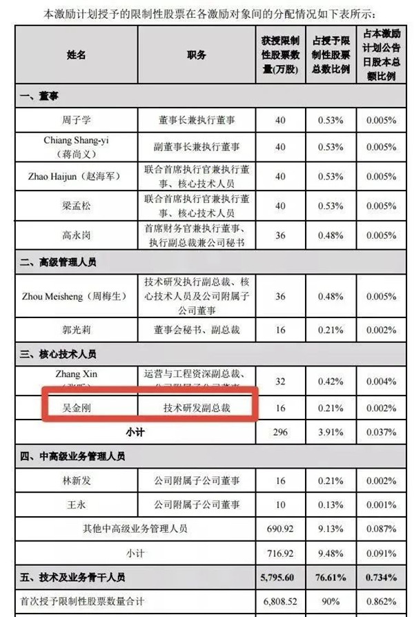 基金君發(fā)現(xiàn),吳金剛獲得的16萬(wàn)股限制性股票看似很多,卻是核心技術(shù)人員中最少的。