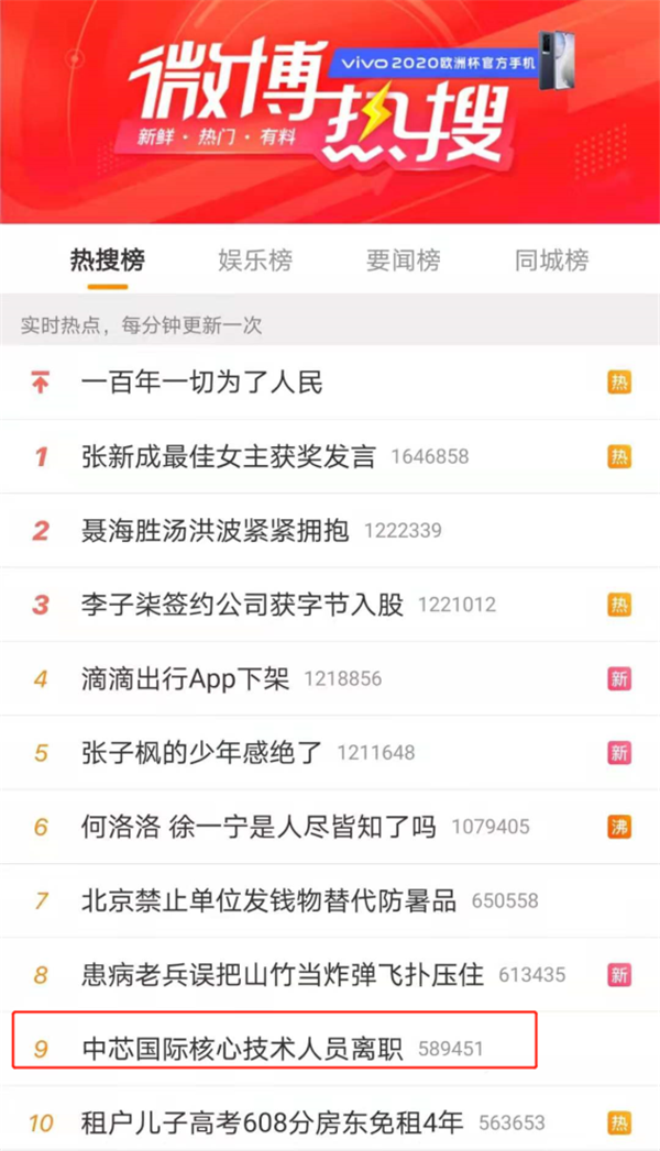 在新浪微博上,中芯國(guó)際核心技術(shù)人才離職,更是沖上了熱搜。