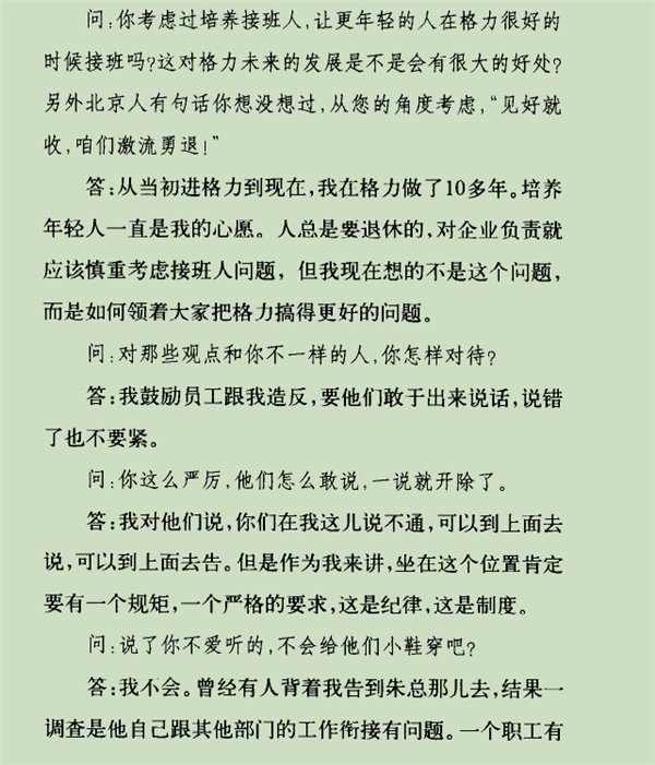 其實(shí),關(guān)于接班人的話題,董明珠最早的回答應(yīng)該還在出書(shū)時(shí)代。在2006年出的《行棋無(wú)悔》一書(shū)里,有人問(wèn)她接班人: