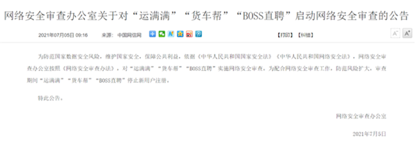 ↑網(wǎng)絡(luò)安全審查辦公室關(guān)于對(duì)“運(yùn)滿滿”“貨車幫”“BOSS直聘”啟動(dòng)網(wǎng)絡(luò)安全審查的公告截圖