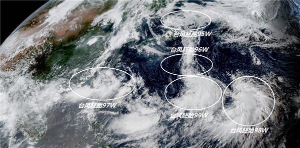 這涌動的熱帶云團(tuán)其實(shí)正是季風(fēng)活躍拉動起來的強(qiáng)盛季風(fēng)槽,在這道季風(fēng)槽中,臺風(fēng)胚胎正在大量涌現(xiàn)。衛(wèi)星云圖上可見,今天下午西太平洋一共有5個臺風(fēng)胚胎正在活動,一個是位于日本以東洋面的臺風(fēng)胚胎95W,一個是位于硫磺島附近的臺風(fēng)胚胎96W,一個是我國臺灣附近的臺風(fēng)胚胎97W,一個是位于美國關(guān)島西北方的臺風(fēng)胚胎99W以及位于美國東北方的臺風(fēng)胚胎98W。