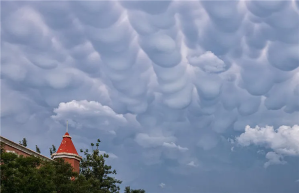 一般來說,在看到這種云,確實相當(dāng)嚇人,很多人根本就沒有見過,而它的形成主要是在極端性氣候的時段,主要是在積雨云下方形成的乳狀型積云,概念就是“當(dāng)下沉氣流中溫度較冷的空氣與上升氣流中溫度較暖的空氣相遇時,將會形成如同一個個袋子形狀的乳狀云”。