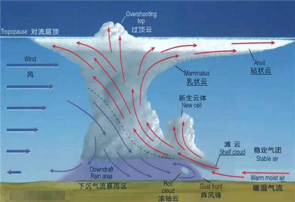 所以這就是它的形成模式。當(dāng)然大家也看到了“積雨云”的概念,我們也叫“雷暴云”,是積狀云的一種,那這就知道這是一種極端性的氣候模式下可能出現(xiàn)的,當(dāng)然也可能在極端性氣候之后出現(xiàn)。所以“石頭云”的出現(xiàn),其實屬于不好氣候現(xiàn)象的征兆,或者是不好的氣候現(xiàn)象已經(jīng)出現(xiàn)了,再次出現(xiàn)的這種情況。