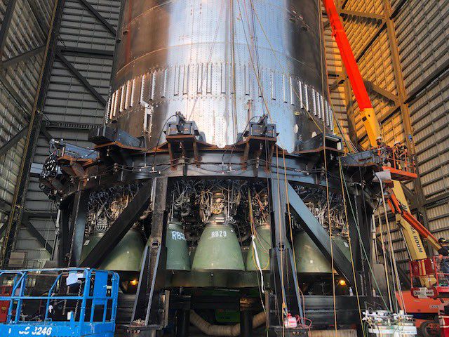 8 月 3 日消息,當?shù)貢r間上周日,SpaceX 完成超級重型火箭助推器原型 B4 的堆疊工作。隨后工程師和技術人員僅僅花了一晚上時間,就將 29 部猛禽發(fā)動機安裝在助推器上。