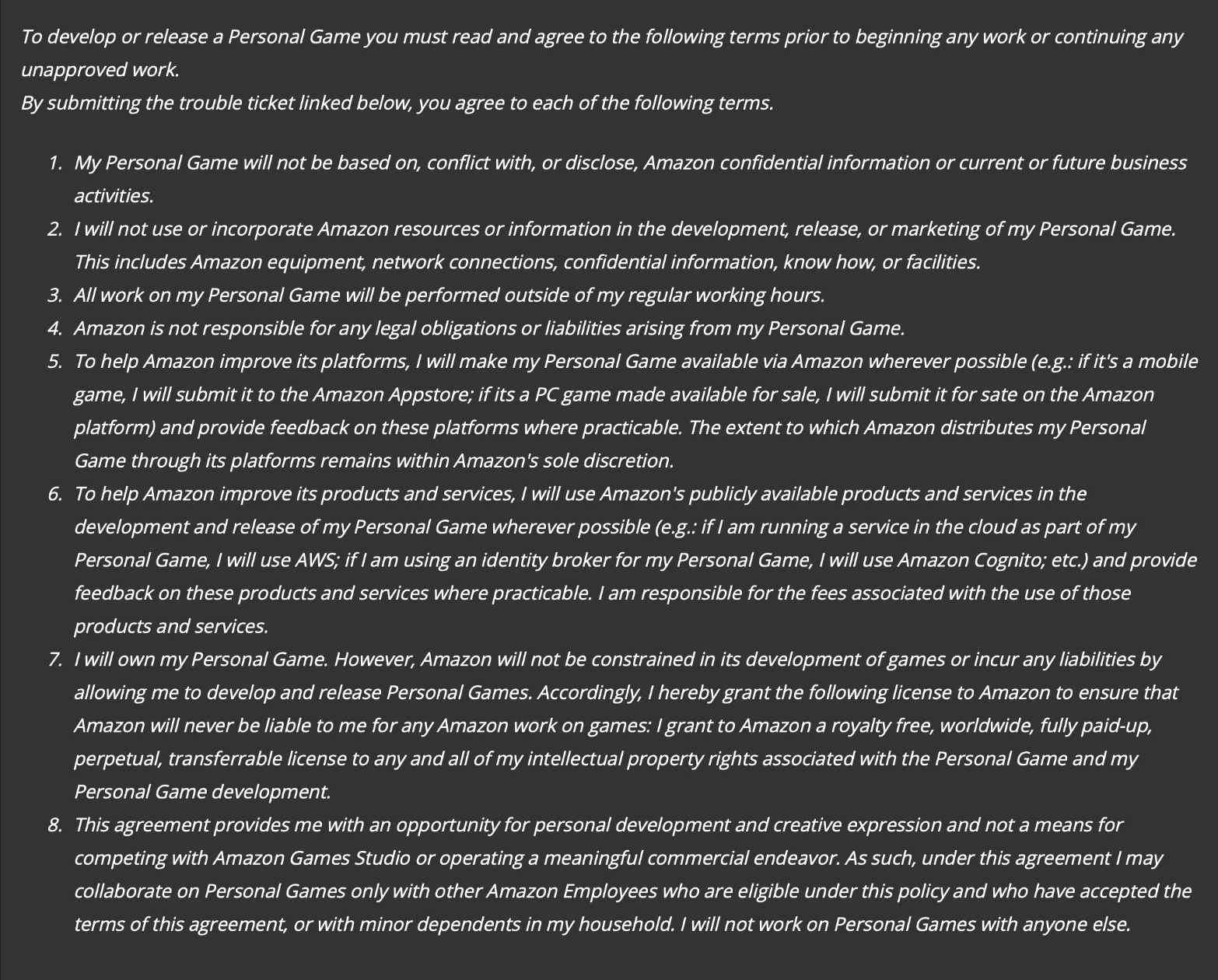 第 7 條政策聲明:“我將免費(fèi)、全球、完全付費(fèi)、永久、可轉(zhuǎn)讓地授權(quán)給亞馬遜以獲得與我的個(gè)人游戲和我的個(gè)人游戲開發(fā)相關(guān)的任何知識產(chǎn)權(quán)。”換言之,負(fù)責(zé)獨(dú)立游戲項(xiàng)目的員工必須將自己的 IP 免費(fèi)轉(zhuǎn)讓給亞馬遜。
