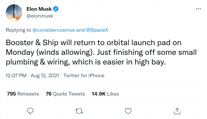 當(dāng)?shù)貢r(shí)間 8 月 12 日,SpaceX 將 Starship 20 從發(fā)射臺(tái)移走,但 Super Heavy Booster 4 仍在那里呆了幾天時(shí)間。據(jù)推測,由于強(qiáng)風(fēng),助推器仍在發(fā)射臺(tái)上。最近,SpaceX CEO 埃隆·馬斯克回復(fù)了一條推問,該推問顯示了本周早些時(shí)候 Super Heavy Booster 4 被帶回生產(chǎn)現(xiàn)場的視頻。馬斯克在推文上指出,助推器和星際飛船將在周一返回軌道發(fā)射臺(tái),這取決于風(fēng)向。