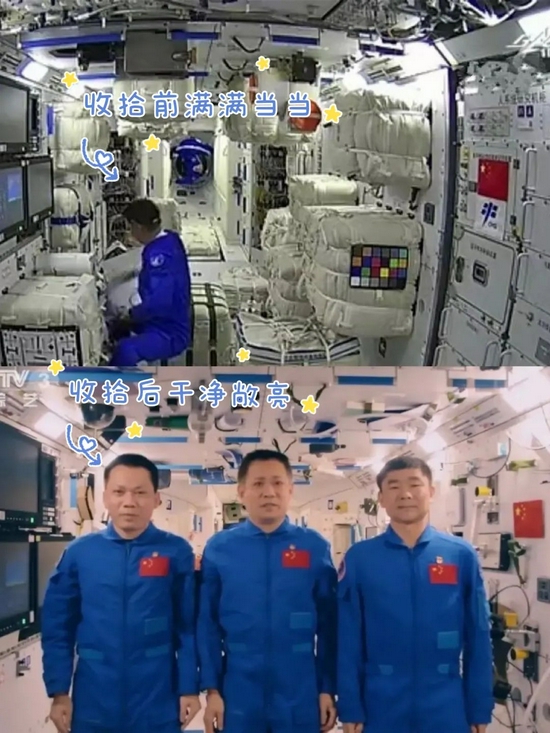 除了開展各項(xiàng)實(shí)驗(yàn),整理內(nèi)務(wù)也不能停。還記得他們剛進(jìn)駐天和核心艙時(shí),艙內(nèi)堆滿了大大小小的包裹,現(xiàn)在艙內(nèi)環(huán)境已變得干凈整潔、秩序井然。收納的秘訣,就是在地板上設(shè)置儲(chǔ)物空間,那些暫時(shí)用不到的包裹,就會(huì)被收納進(jìn)空間站的夾層之中,使“太空家園”更加溫馨舒適。