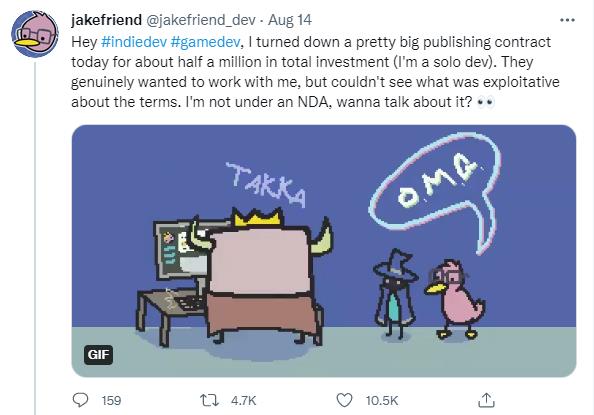 近日,一位 Twitter 名叫 “Jakefriend” 的獨(dú)立游戲開發(fā)者發(fā)文訴說其近期遇到的一件差點(diǎn)鑄成大錯(cuò)的事情,某個(gè)獨(dú)立游戲發(fā)行商向 Jakefriend 提出要投資其手繪風(fēng)動(dòng)作冒險(xiǎn)游戲 《Scrabdackle》, 并且出資 50 萬加元,但在簽署合同時(shí),他發(fā)現(xiàn)合同不僅可能奪走該游戲的版權(quán),甚至還會(huì)讓其負(fù)債終生。