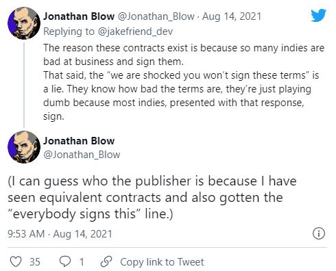 在其發(fā)布這些合同內(nèi)容后,許多開發(fā)者表示十分熟悉,并開始猜測這家發(fā)行商到是誰,游戲《見證者》開發(fā)者 Jonathan Blow 發(fā)帖回應(yīng):“我已經(jīng)猜出出版商是誰,因?yàn)槲铱催^類似的合同。”隨后解釋道:“這個(gè)問題非常普遍,當(dāng)你描述這些東西的時(shí)候,每個(gè)人都認(rèn)為他們知道發(fā)行商是誰,但每個(gè)人的猜測卻又不同。”