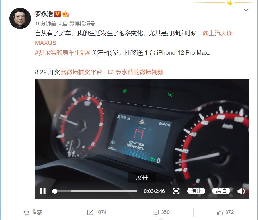 而羅永浩因商務(wù)差旅需要,每年要乘坐 100 多趟飛機(jī),限制高消費(fèi)使得遠(yuǎn)途交通成了一個(gè)問題,為此羅永浩招商房車品牌。