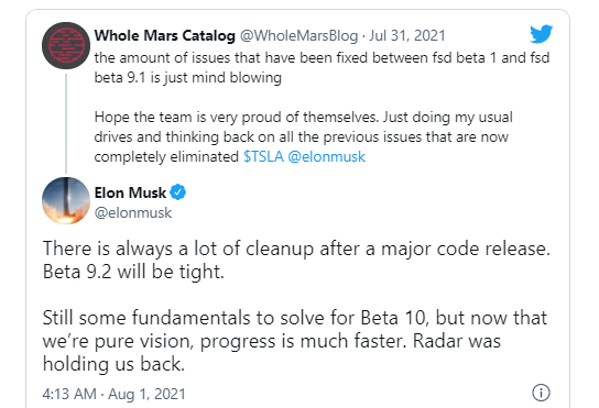 馬斯克還發(fā)推文稱,他剛剛駕駛 FSD Beta 9.3 從帕薩迪納到洛杉磯國(guó)際機(jī)場(chǎng),這次旅程"大有改進(jìn)!"在本月初,馬斯克說特斯拉將每?jī)芍茉诩又輹r(shí)間午夜發(fā)布新版本的 FSD。然后他承諾 Beta 9.2 版將是"緊密的",他說雷達(dá)阻礙了公司的發(fā)展,現(xiàn)在已經(jīng)完全接受了純粹的愿景,進(jìn)展會(huì)更快。