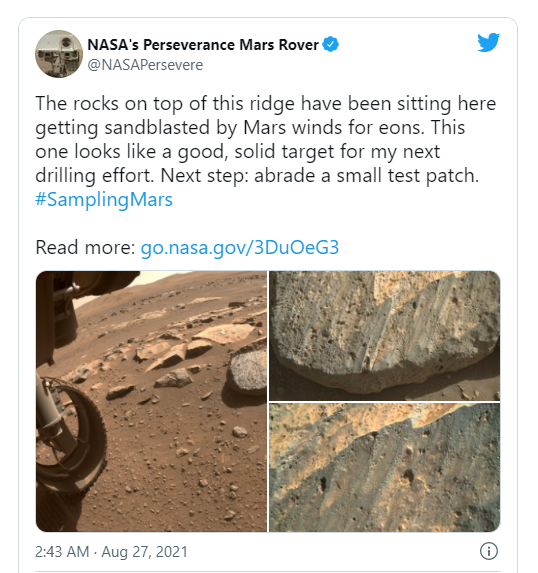 NASA 現(xiàn)在已經(jīng)鎖定了一塊被稱為"Rochette"的巖石。該漫游車(chē)將用一個(gè)研磨工具對(duì)巖石進(jìn)行一些粗加工,以獲得更好的外觀,并幫助團(tuán)隊(duì)決定這是否確實(shí)是他們想要取樣的巖石。如果可以的話,漫游車(chē)將鉆進(jìn)巖石,收集一個(gè)鉛筆厚的核心部分,并將其封入一個(gè)樣品管。