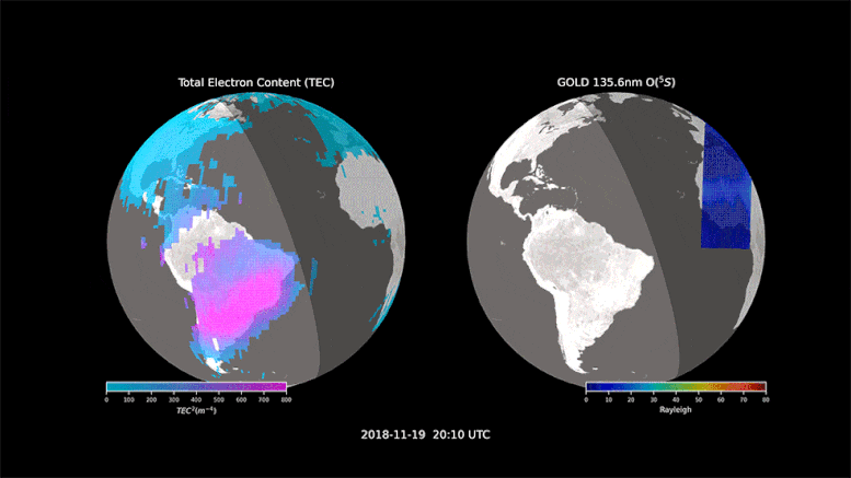 GOLD 觀察的目標之一是被稱為赤道電離異?;蚝喎Q EIA 的帶狀粒子,EIA 根據(jù)電離層的條件發(fā)生巨大的變化,而且這些帶狀粒子可以移動位置。GOLD 允許科學(xué)家長期觀察這些帶狀粒子。由于 GOLD 的協(xié)助,科學(xué)家能夠觀察到一些挑戰(zhàn)以前理論的東西。在 2018 年底,南部帶狀粒子更加向南漂移,而北部帶狀粒子保持穩(wěn)定。